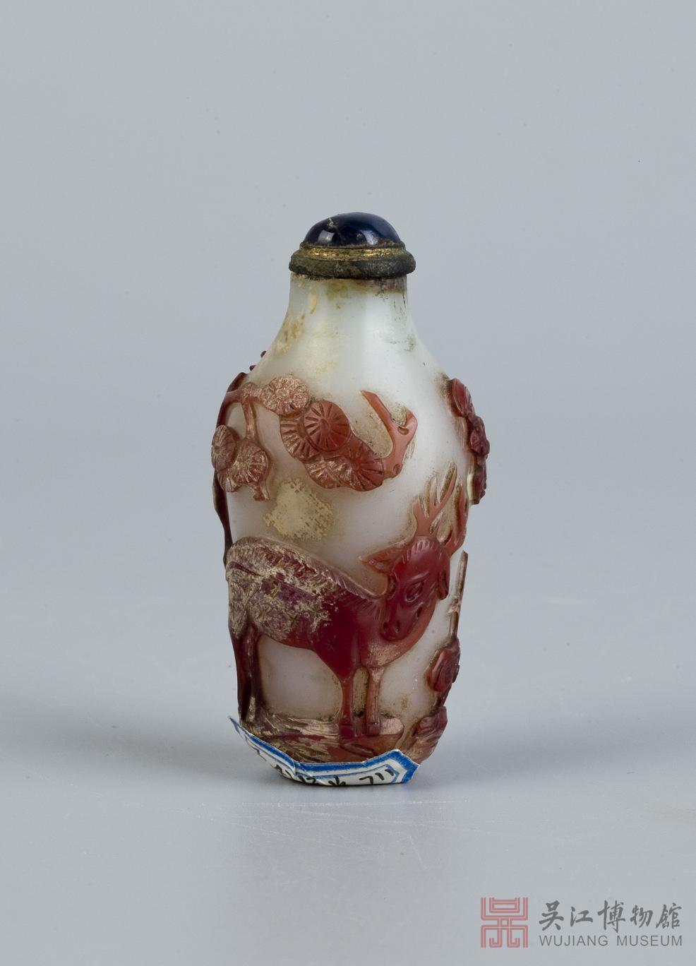 此件鼻烟壶为料器(玻璃),盖为蓝色料器,壶身外部镶嵌象征福、禄、寿的蝙蝠、鹿和灵芝图案。