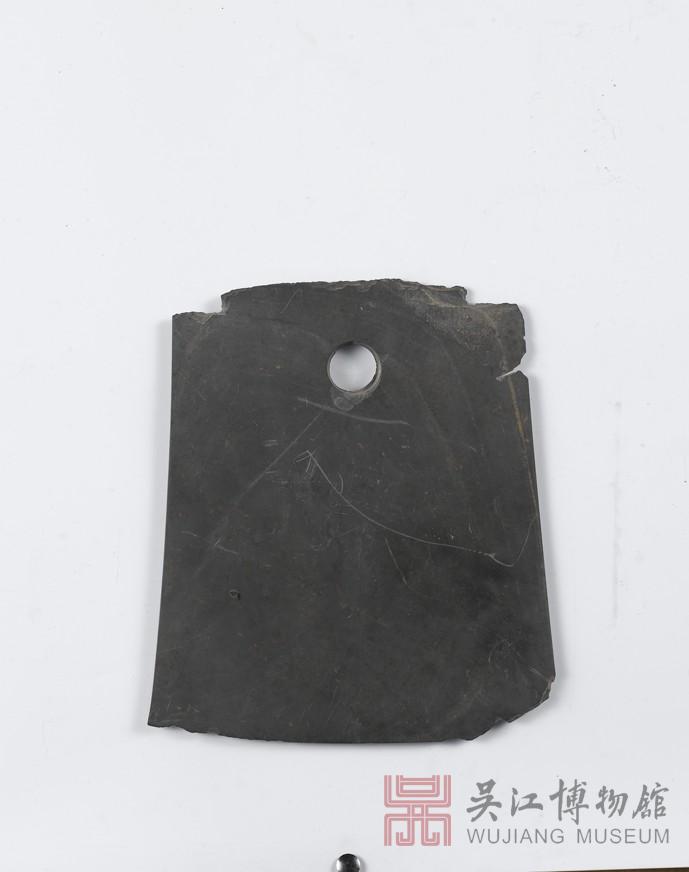 体形略呈长方形,双面刃略宽,刃缘微呈弧形,背端中部穿单孔。器形规整,磨制精细。钺是一种形似斧的武器,由实用工具石斧演变而来。斧、钺在形制上相似,区别在于钺的刃部比斧宽阔,弧曲度更大,刃端两角微微上翘,有的还接近半月形的样式。石钺最后演变为权力和威严象征的礼器,多为酋长、部落首领所占有,因此多出土于新石器时代的贵族墓葬中