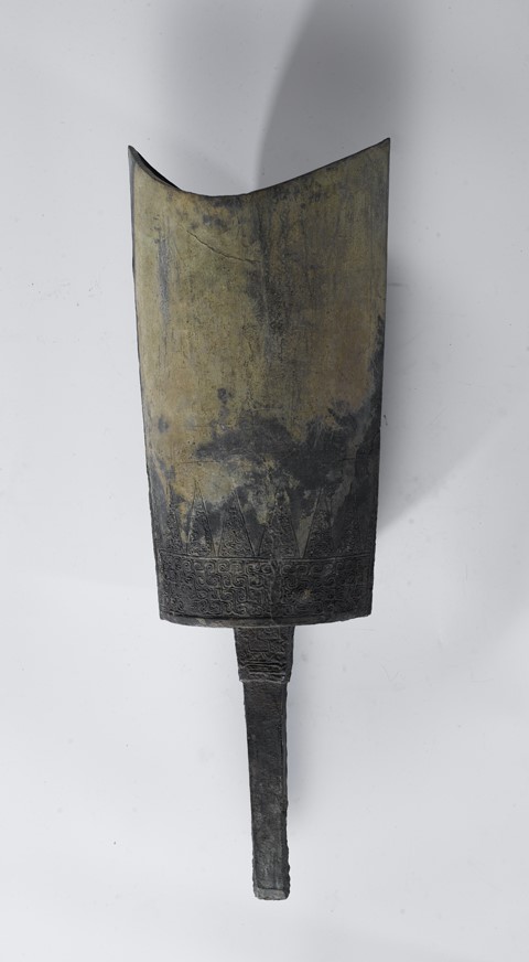 青铜剑是古代贵族随身佩带的短兵器,分为剑身、茎和格三部分。剑身的最前端为锋,正中突起的棱被称为脊,脊的两旁坡下部称为从,而从的两边就是刃部。剑柄叫茎,茎的外端则是剑首,茎和剑身之间的护手叫做格。