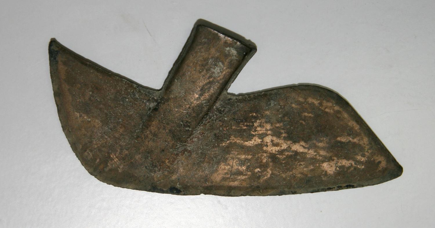 鎒是一种耘田除草的工具。其基本形制为一方形銎口,前接刃部,刃部正面有蓖齿纹,以增大刈草时的摩擦力。这件鎒刃部作V型,两侧边如双翼,刃端作锐角,无蓖齿纹。