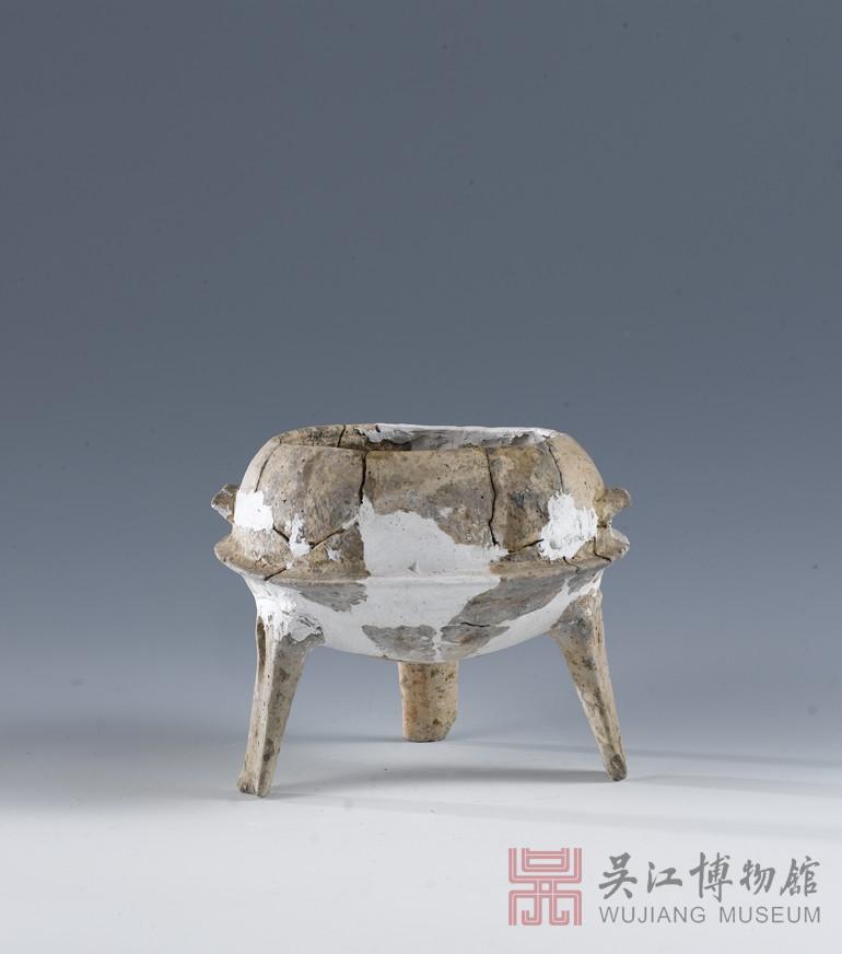 敛口,方唇。圆肩,肩部有一对长条形鸡冠鋬。弧腹,腹部较深,腹饰一周凸棱。圜底,下接三扁足,足外侧有一长条形凹槽。陶鼎在制作时掺杂了许多砂粒,可以承受火的持续燃烧,不会裂开。