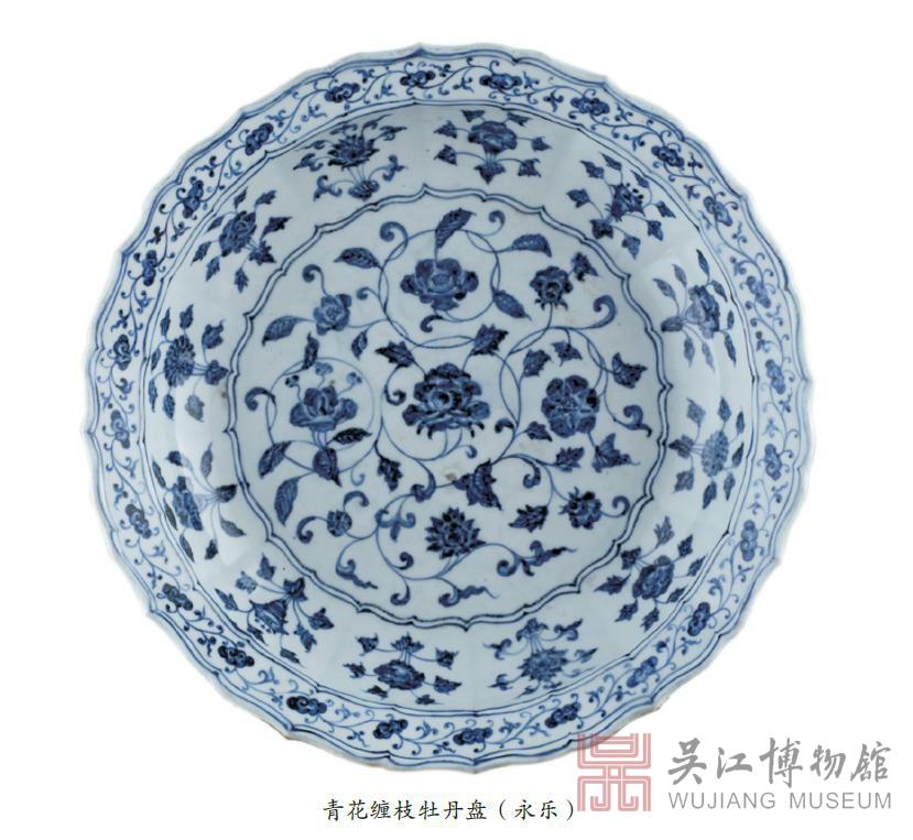 口为花瓣形,圈足。内外均绘青花纹样,口沿绘一周缠枝灵芝纹,内外花瓣腹壁上均绘十二朵均匀排列的折枝牡丹纹。盘心亦绘有缠枝牡丹纹。各纹饰间,均用双线花瓣形纹相间隔。内外遍施肥厚莹润的白釉,釉呈鸭蛋青色,仅圈足内露胎,胎质细腻洁白。该器纹饰以进口苏泥勃青料绘制,具有发色浓艳,带铁锈斑等特点。器物构图丰满有秩,画技精美,色调鲜艳和谐,制工精湛,造型华贵雅洁。