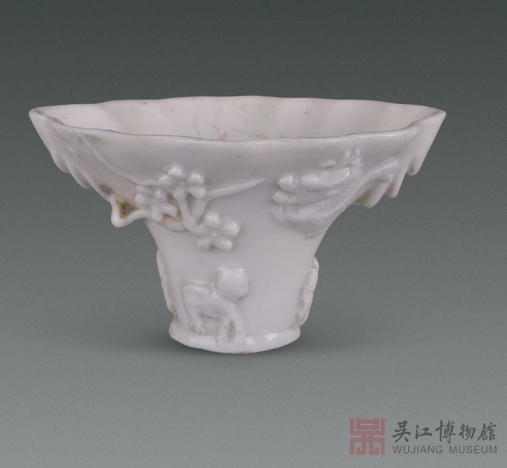 口为椭圆形,通体施白釉,明代德化窑生产。杯子像倒扣的马蹄,故得名马蹄杯。杯身有堆塑纹饰,有梅、鹿、鹤、龙和虎等图案。梅、鹿均为“禄”之意,鹤有“长寿”之意,龙虎纹是我国古代铜、瓷器中器最常见的纹饰,集中体现了中华传统文化的精髓。