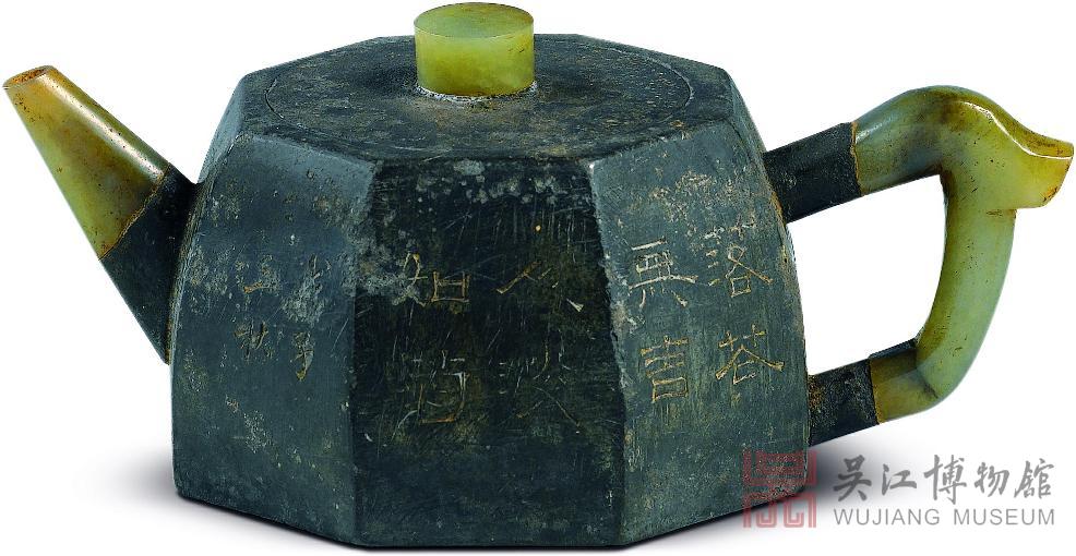 壶是紫砂壶,外部用锡包裹,盖钮、壶把、壶嘴用玉镶嵌。壶身刻字,壶内刻有“杨彭年制”四字。由此可知,此壶为清代嘉庆、道光年间制壶名家杨彭年所制。杨彭年,字二泉,号大鹏,浙江桐乡人,生卒不详。
