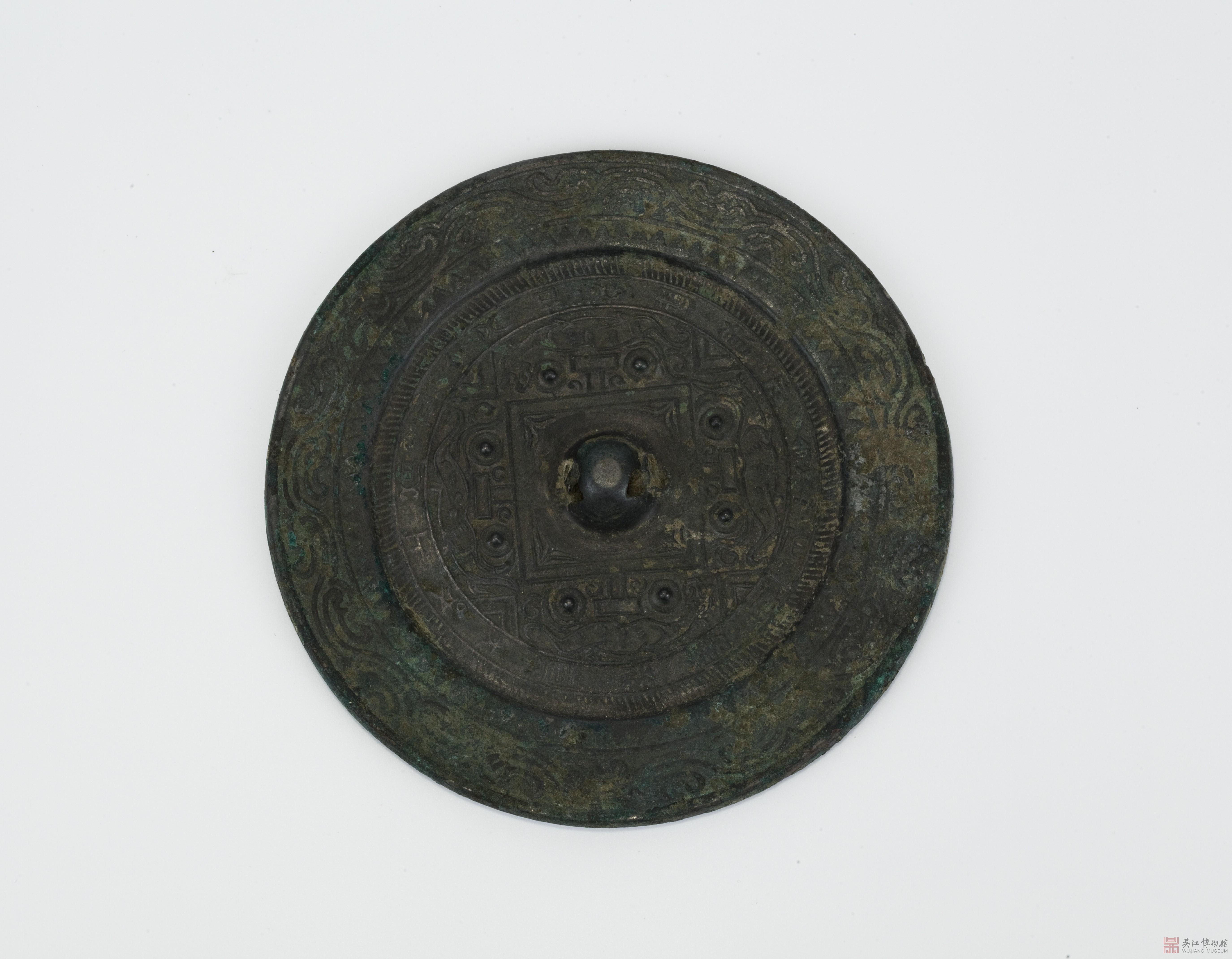 圆形,柿蒂形钮座。座外有大方格、八乳及博局纹。方框四边各向外伸出一“T”形符号,与“L” 形符号相对。方格四角又与“V” 形符号相对,将镜的内区分为四方,用青龙、白虎、朱雀、玄武作为四方的主要装饰。外区铭文待考,外缘为一周锯齿纹和和一周波浪式云纹带。“V”形符号,过去人们称为“规”。“T”和“L”形符号,被称为“矩”。因此,这种类型的铜镜被称为“四神规矩铜镜”,是汉代典型的铜镜种类之一。