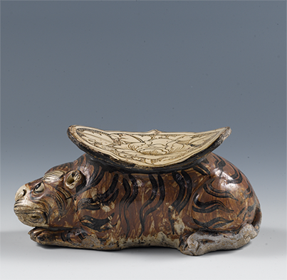磁州窑白釉黑花牡丹纹虎枕